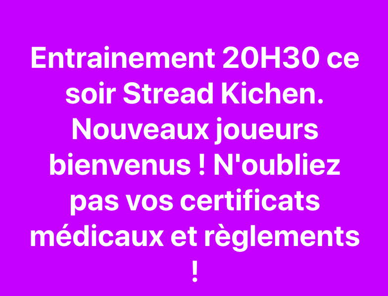 Entrainements au gymanse de Stread Kichen tous les lundi à 20H30.