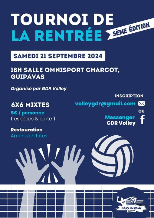 5è Tournoi de la rentrée organisé par les Gars Du Reun Guipavas le samedi 21 septembre à partir de 18h à la salle Charcot. Tournoi en 6x6 mixte obligatoire. 5€ par joueur.